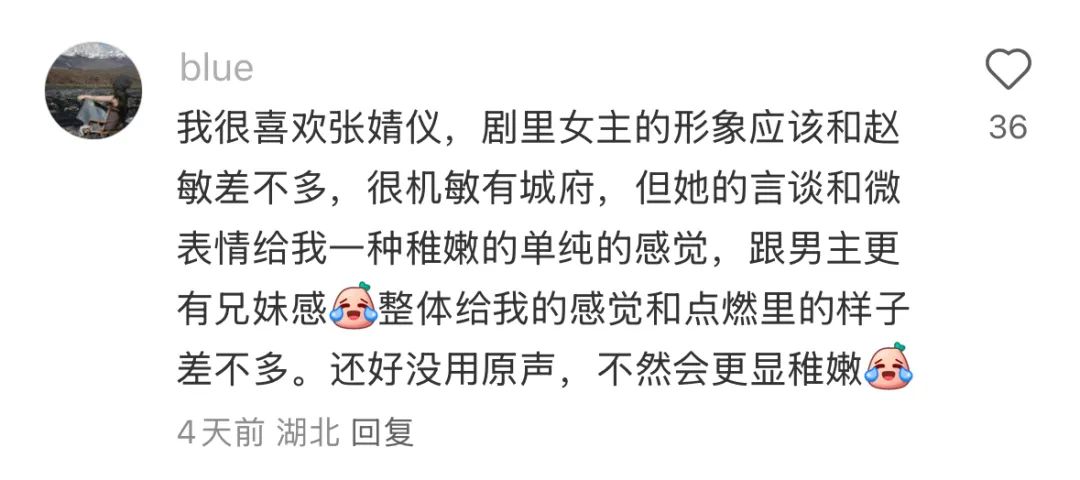 但是张婧仪似乎没往深处琢磨,每场戏她都老老实实地按剧本演了,最后给人的感觉是,前后不连贯,好像她同时演了好几个人。